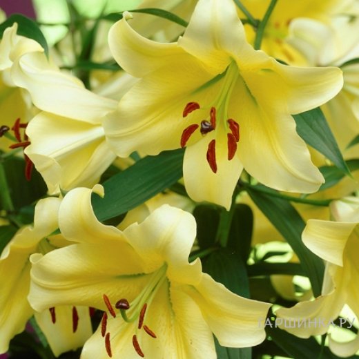 Лилия Еллоуин ОТ-гибрид желтая - высокорослый сорт с очень крупными цветками. Цветок до 20 см и более в диаметре, лимонно-желтый, с пурпурными пыльниками, лепестки у основания зеленоватые, отогнутые, точеные. Высота растения 140 -160 см. Цветет лилия в июле-августе.