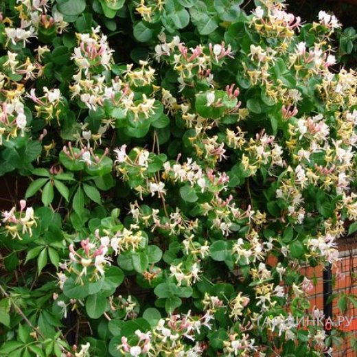 Жимолость каприфоль – это вьющаяся кустарниковая лиана длиной до 5 м. Молодые побеги у нее голые, светло-зеленые, на старых ветвях кора светло-бурая, отслаивающаяся продольными полосками. Листья широкоэллиптические, супротивные, с плотной кожистой поверхностью приятного сизовато-зеленого цвета, снизу светло-голубоватые. Цветки, как у всех жимолостей трубчато-раструбовидные длиной до 5 см, собраны в оригинальные головчатые соцветия, плотно расположенные в пазухах листьев верхней части побегов. При этом самые верхние листья, попарно срастаясь основаниями, образуют единые дисковидные образования с плотно прилегающими цветками, а затем оранжевыми ягодообразными плодами. В окраске цветков одновременно присутствуют белый, желтоватый, пурпурный, красно-фиолетовый цвета. Внутри они кремово-белые. Цветет каприфоль с начала июня до 20-25 дней. В тихие летние вечера вокруг обильноцветущих кустов струится приятный пряный аромат. Лиана остается декоративной и после цветения, а в августе она становится еще краше. В это время созревают плотно сидящие на листьях, как бы вросшие в них, оранжевые плоды. Ягоды полупрозрачные, напоминают бусины, весьма декоративные.