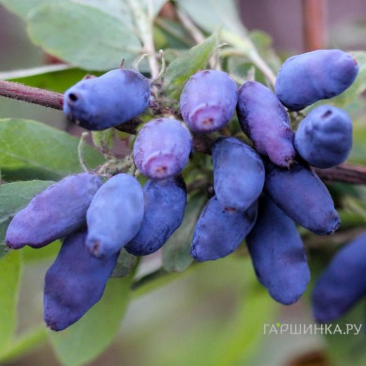 Это крупноплодная разновидность. Ягодки на кустах вырастают массой 0,9-1,5 г. Форма плодов удлиненно-овальная, иногда стручковидная. Спелая жимолость покрывается темно-фиолетовым окрасом, разбавленным густым сизым налетом, напоминающим восковый. Кожица у ягод плотная, но не жесткая, с заметной бугристостью. Крепятся на укороченных плодоножках ягоды крепко, при этом отрыв у плодов сухой. Спелые ягоды не осыпаются.