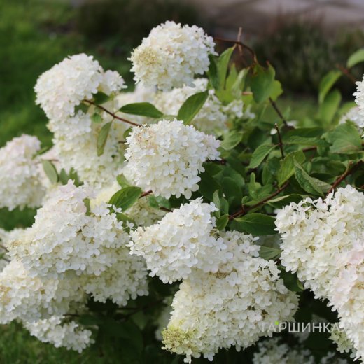 Гортензия метельчатая Саммер Сноу (Hydrangea paniculata Summer Snow) - Цветет с июля до осени, кусты в это время покрыты пеной поникших от собственной тяжести зелено-белых соцветий (до 35 см).
