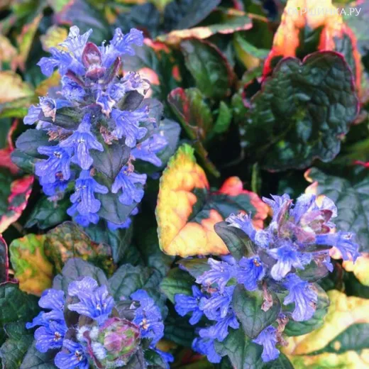 Живучка (Аюга) ползучая Рейнбоу - многолетник с пёстрыми листьями. Образует плотные «коврики» высотой 25 см. Листья глянцевые, бронзово-зелёные с неравномерными кремовыми и тёмно-розовыми краями, меняют цвет в течение сезона. Цветки тёмно-синие, в колосовидных соцветиях. Цветение в мае-июне. Место солнечное или полутенистое. Почва влажная, дренированная. Зона 4 (до -34ºС).