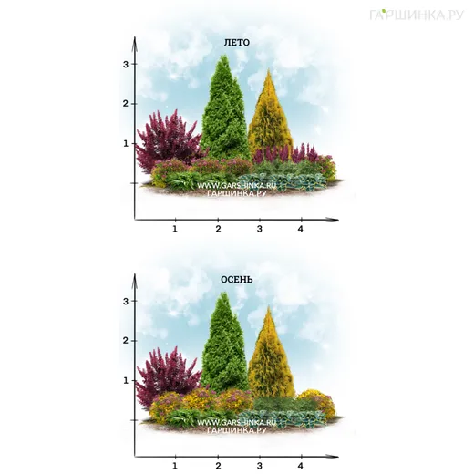 - Полив: Регулярно поливайте миксбордер, особенно в жаркую и сухую погоду. Туям и барбарису потребуется примерно 10 литров воды на одно растение, а спиреи, астильбе и хостам - около 5 литров.