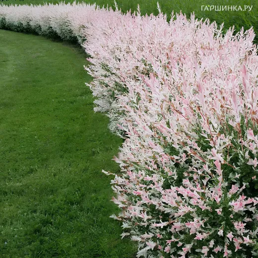 Ива Хакуро Нишики - изящный раскидистый кустарник до З м высотой. Первыми ранней весной на японской иве появляются темно-пурпурные, торчащие в сторону сережки, издающие во время цветения тонкий гиацинтовый аромат. Вслед за ними — пестрые листья, вначале розовые, а потом сливочно-бело-зеленые. Особенно ярки белоснежные верхушечные листочки в первой половине лета. Более сочную расцветку ива имеет при выращивании кустиков на солнце, а сохраняет ее дольше в полутени, тени и в холодные влажные годы.