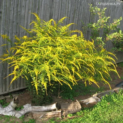 Золотарник (Солидаго) гибридный Файрворкс - растение 70-90 см высотой с гроздьями золотистыо-желтых цветков в узких заостренных поникающих метелках. Куст фонтанообразной формы. Цветет обильно и продолжительно в июле - августе. Хорош в смешанных цветниках, букетах. Предпочитает солнечные участки с увлажненной, хорошо дренированной почвой. Зимостоек. Под зиму необходима обрезка наземной части на высоте до 15 см. Листья продолговато-ланцетные. Корзинки мелкие, многочисленные, собраны в пирамидальную метелку 35-40 см длиной.