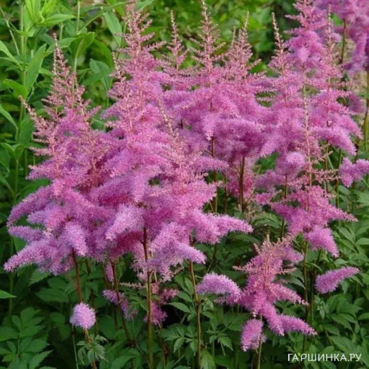 Астильба Арендса Аметист – многолетнее корневищное растение. Это высокое растение, достигающее 110 см. В диаметре от 50 до 80 см. Темно-зеленая листва, которая имеет маленькие зубья по краям. Цветы небольшие по размеру и собраны в соцветия длиной от 20 до 30 см. Окрас у цветов фиолетово-розовый или ярко-сиреневый. Начало цветения приходится на конец июня – начало июля. Длительность – 20-30 дней.